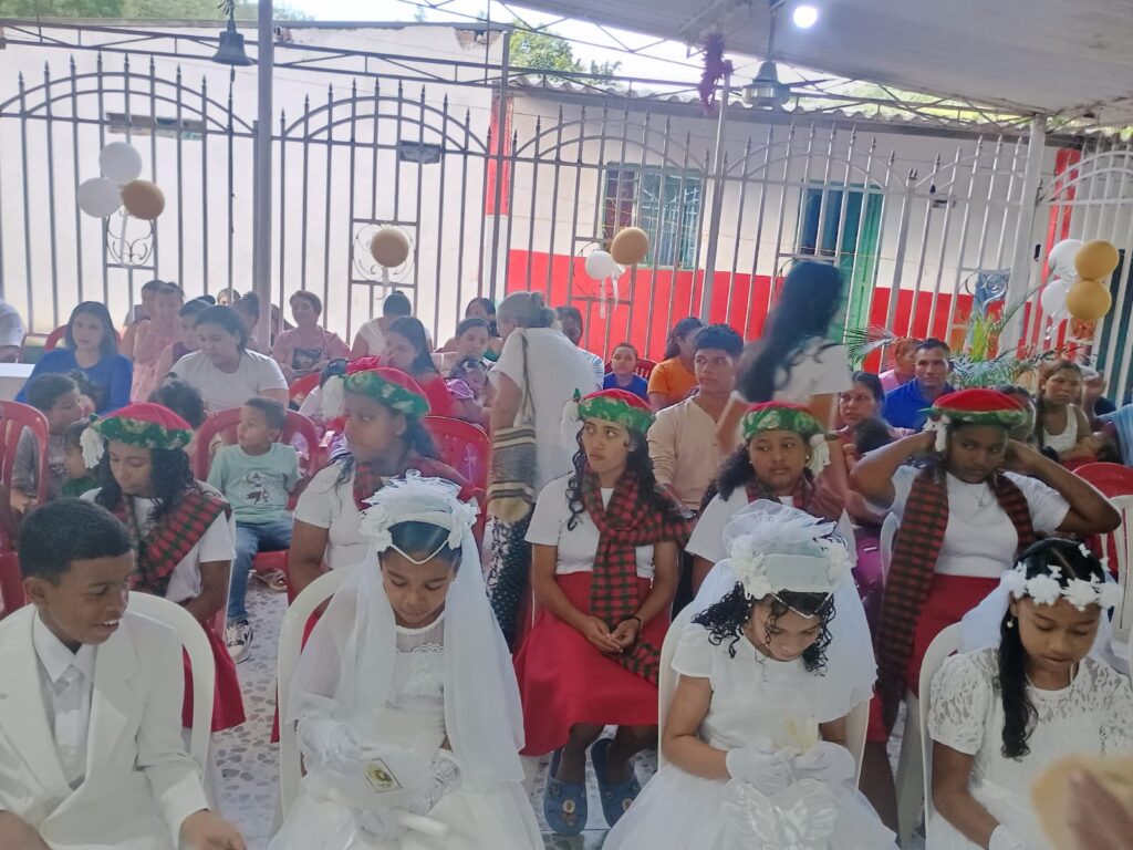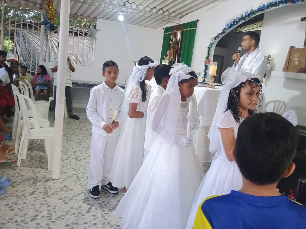 El 8 de diciembre, en las cabañas de Buritaca, ubicadas a lo largo de la Troncal del Caribe, un grupo de cuatro niñas y tres niños recibió con gran alegría el sacramento de la Eucaristía. Fue una celebración sencilla y profundamente significativa para las familias y la comunidad, que acompañaron con fe este primer encuentro de los niños con Jesús Sacramentado.